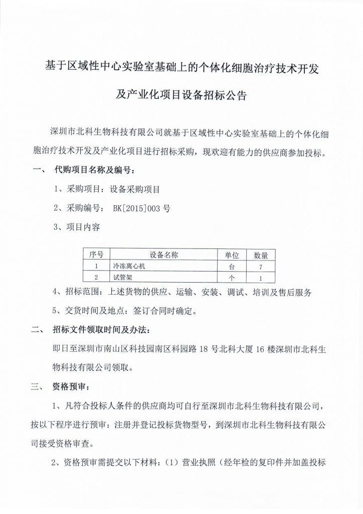 基于區(qū)域性中心實(shí)驗(yàn)室基礎(chǔ)上的個(gè)體化細(xì)胞治療技術(shù)開發(fā)及產(chǎn)業(yè)化項(xiàng)目設(shè)備招標(biāo)公告
