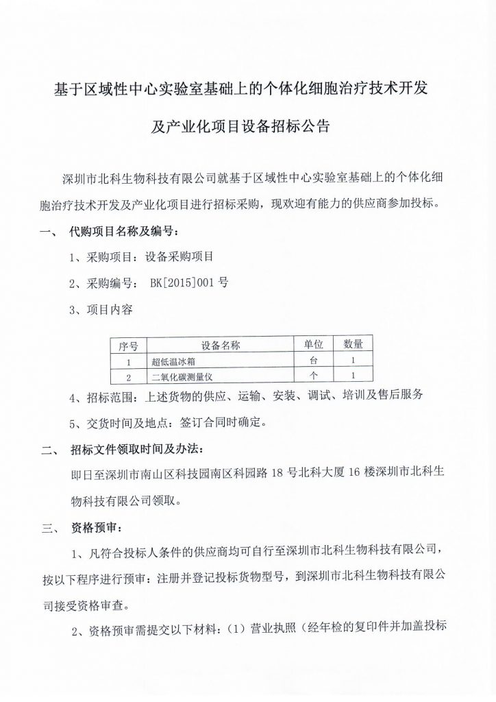 基于區(qū)域性中心實(shí)驗(yàn)室基礎(chǔ)上的個(gè)體化細(xì)胞治療技術(shù)開發(fā)及產(chǎn)業(yè)化項(xiàng)目設(shè)備招標(biāo)公告