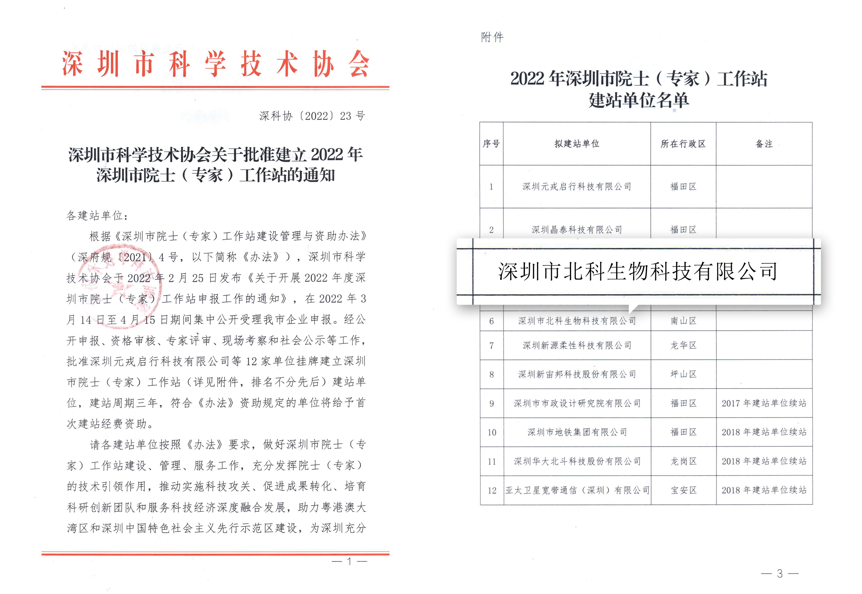 2022年6月27日,深圳市科學(xué)技術(shù)協(xié)會發(fā)布通知,按照《深圳市院士(專家)工作站建設(shè)管理與資助辦法》(深府規(guī)〔2021〕4號)有關(guān)要求,經(jīng)過公開申報、資格審核和專家評審、現(xiàn)場考察和社會公示等工作,同意深圳市北科生物科技有限公司建立深圳市院士(專家)工作站。