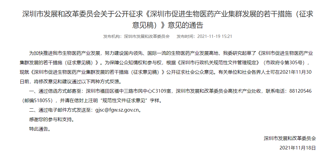 近日,為落實《中共中央 國務(wù)院關(guān)于支持深圳建設(shè)中國特色社會主義先行示范區(qū)的意見》《深圳市關(guān)于進一步加快發(fā)展戰(zhàn)略性新興產(chǎn)業(yè)的實施方案》(深府〔2018〕84號)等政策精神,充分銜接《深圳市促進生物醫(yī)藥產(chǎn)業(yè)集聚發(fā)展指導(dǎo)意見》及相關(guān)配套文件(深府辦〔2020〕2號),加快推進我市生物醫(yī)藥產(chǎn)業(yè)發(fā)展,努力建設(shè)國內(nèi)領(lǐng)先、國際一流的生物醫(yī)藥產(chǎn)業(yè)發(fā)展高地,深圳市發(fā)改委研究起草了《深圳市促進生物醫(yī)藥產(chǎn)業(yè)集群發(fā)展的若干措施(征求意見稿)》。